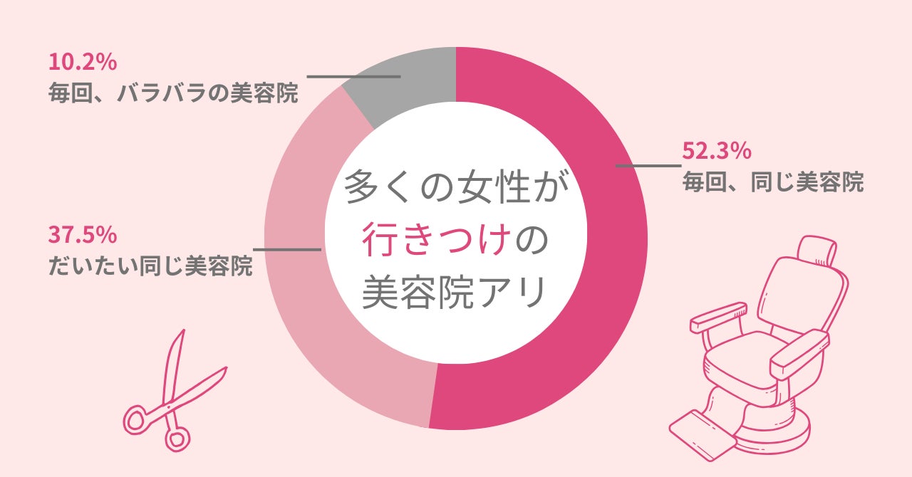 ・52.3%の女性が毎回同じ美容院に行き、10.2%の女性は毎回バラバラの美容院に行く