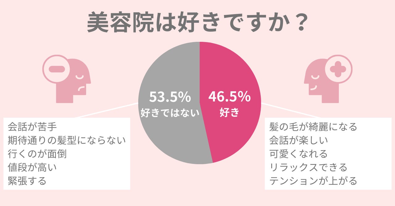 調査の結果、53.5%の女性が美容院が好きではなく、46.5%の女性が美容院が好きで、両者ともに理由はさまざまでした。