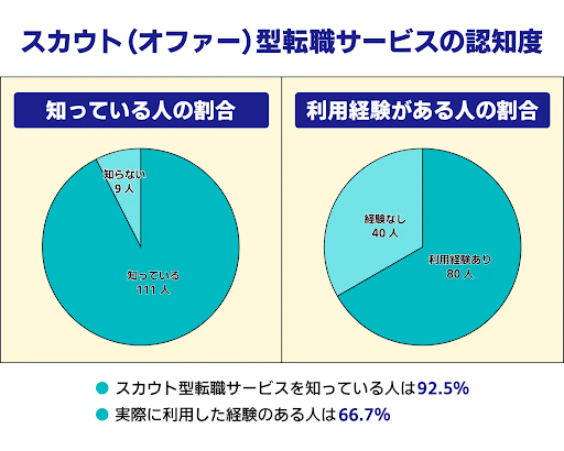 アントプロダクション株式会社が2023年に実施した調査によれば、スカウト(オファー)型サービスの認知度は92.5%、利用経験がある人は66.7%と、9割以上の人が認知し、3人に2人が利用していることがわかりました。