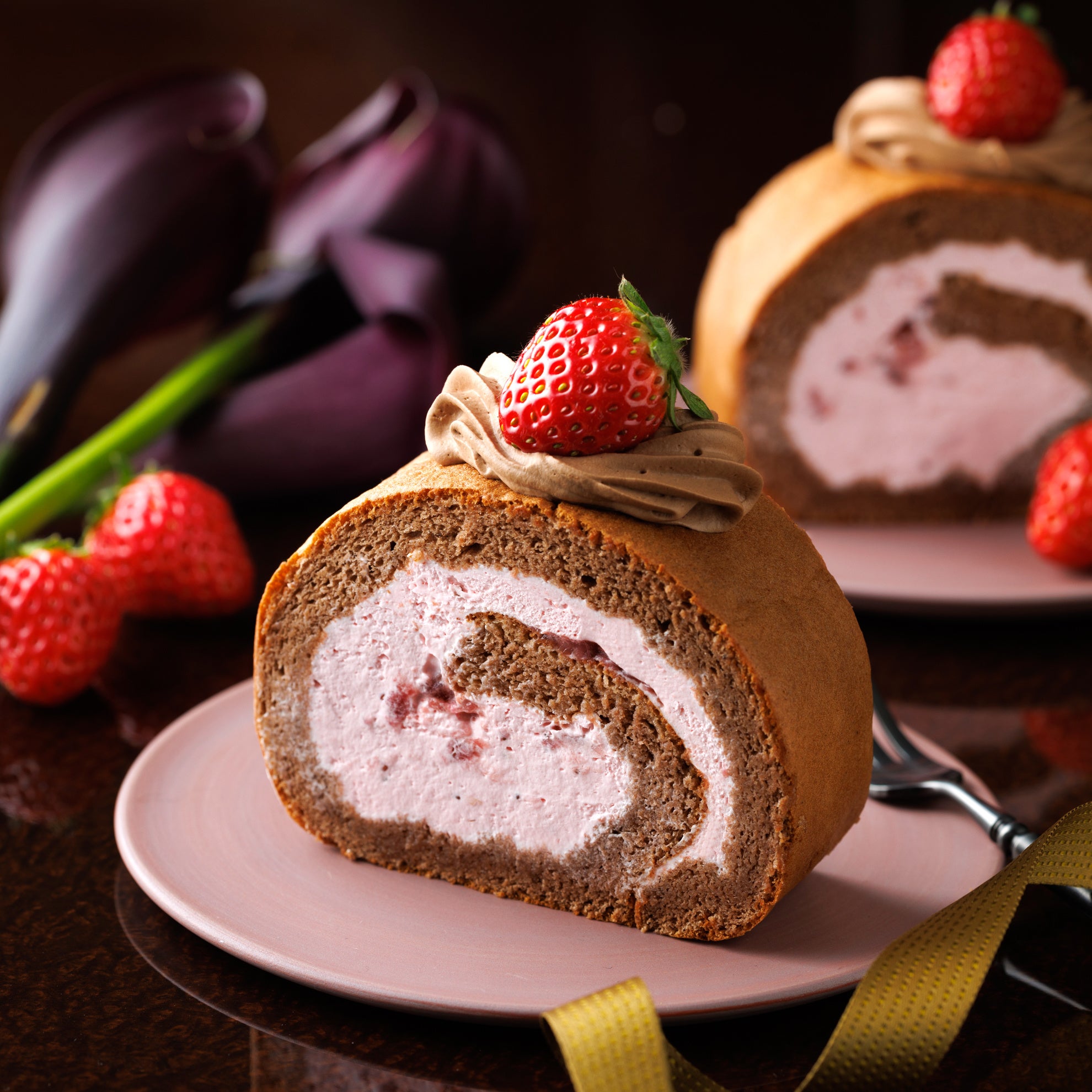 甘酸っぱいいちごクリームをしっとりココアスポンジで包んで、チョコクリームと完熟いちごを飾ったロールケーキです。ココアやチョコクリームの甘さといちごの甘酸っぱさが楽しいチョコロールです。