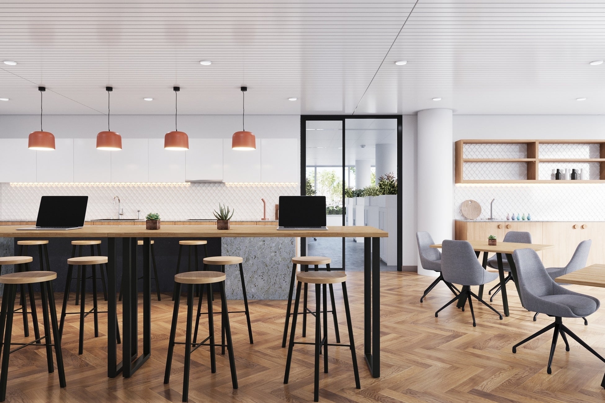 (1)オフィスでは、ハイチェアを取り入れて自由度の高いワークスペースに