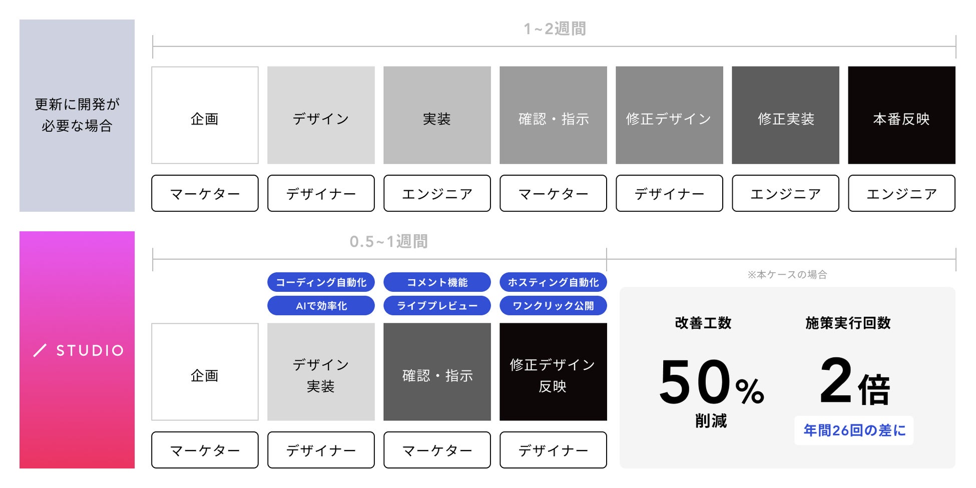 gazのサイト制作の特徴として納品までの期間が短いため、上記画像のケースの場合、工数を最大50%削減・施策実行回数2倍となり運用改善が可能になります。効率化を実現し、コンテンツ制作など必要な部分に時間を費やすことができます。