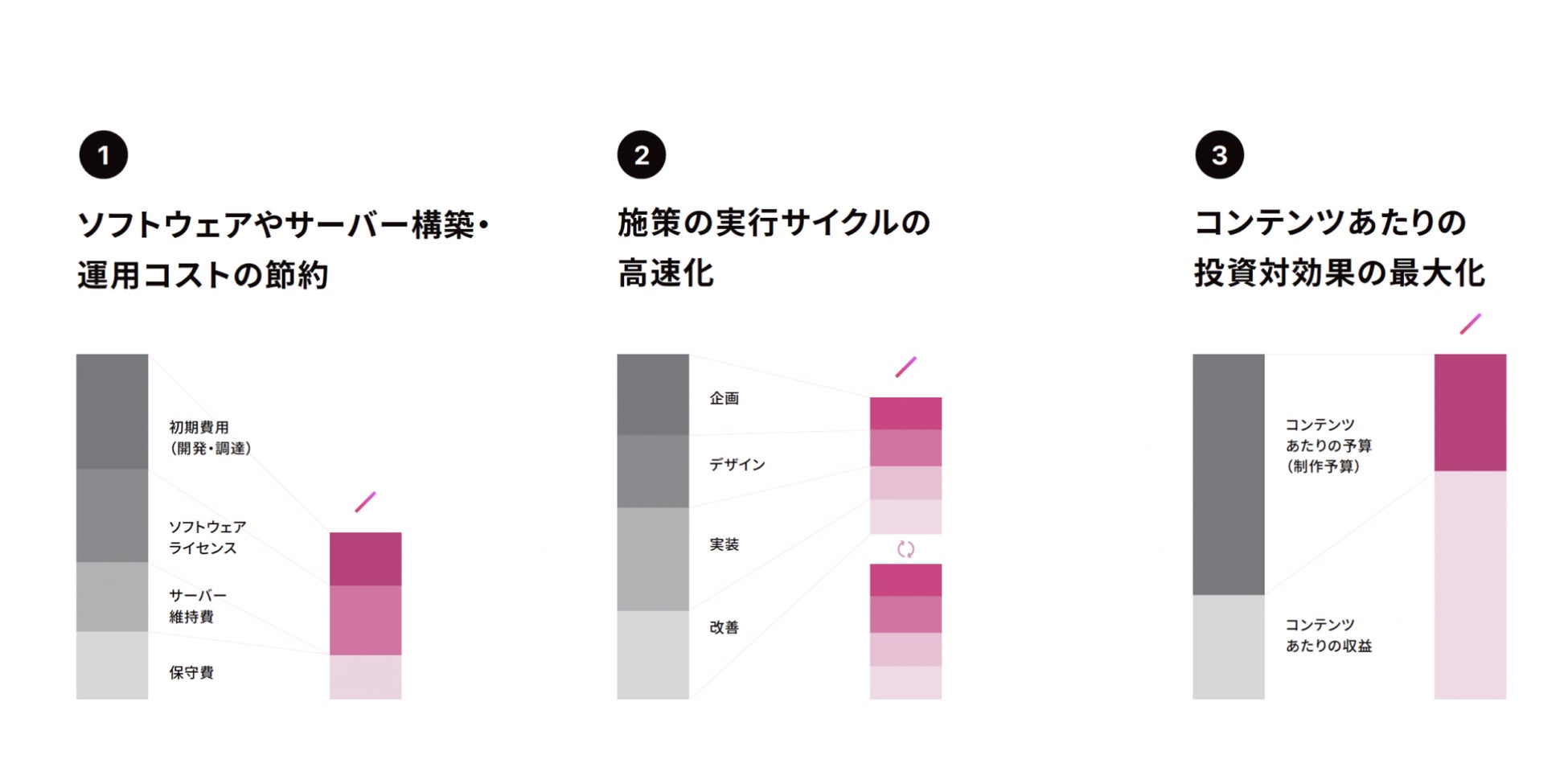 サイト公開後、エンジニアいらずでサイトの更新が可能になります。ランニングコストやコミュニケーションコストを下げることで人件費や工数の削減を実施しつつ、マーケティング観点では高頻度でのWEBサイトのコンテンツ更新や情報のアップロードを行うことができます。そのため依頼から施策の実施にかかるコミュニケーションコストや特定期間内でのサイクルが早まり、施策回数が大幅に増加する傾向にあります。
