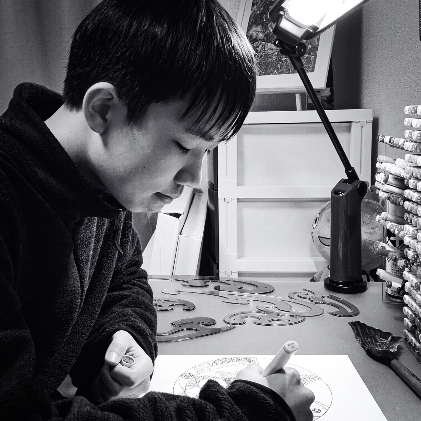 定規を駆使する【ルーラーアート】は、幾何学模様の生き物やカラフルな色が特徴。強いこだわりから生み出される作品は繊細かつカラフルな配色、見た人が元気に楽しくなれる作品を目標に描いている。