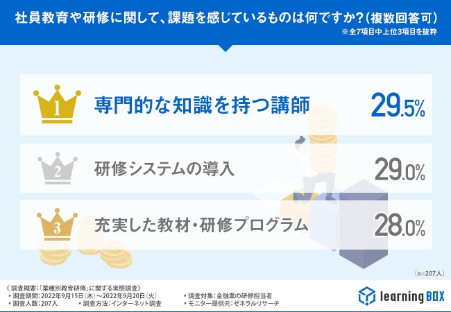 - 金融業界の研修担当者の約3割が「専門的な知識を持つ講師」に課題を感じている