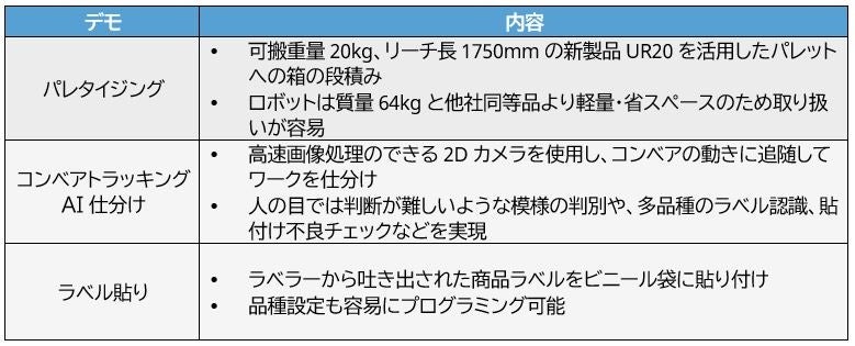 URは本展示会にて、パレタイジングやコンベアトラッキング、パッケージへのラベル貼りといった工程自動化のデモンストレーションを行います。ぜひこの機会にURのブースまでお越しいただけますよう、お願い申し上げます。
