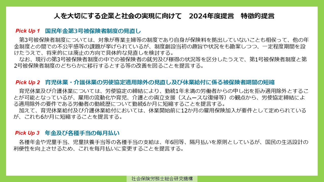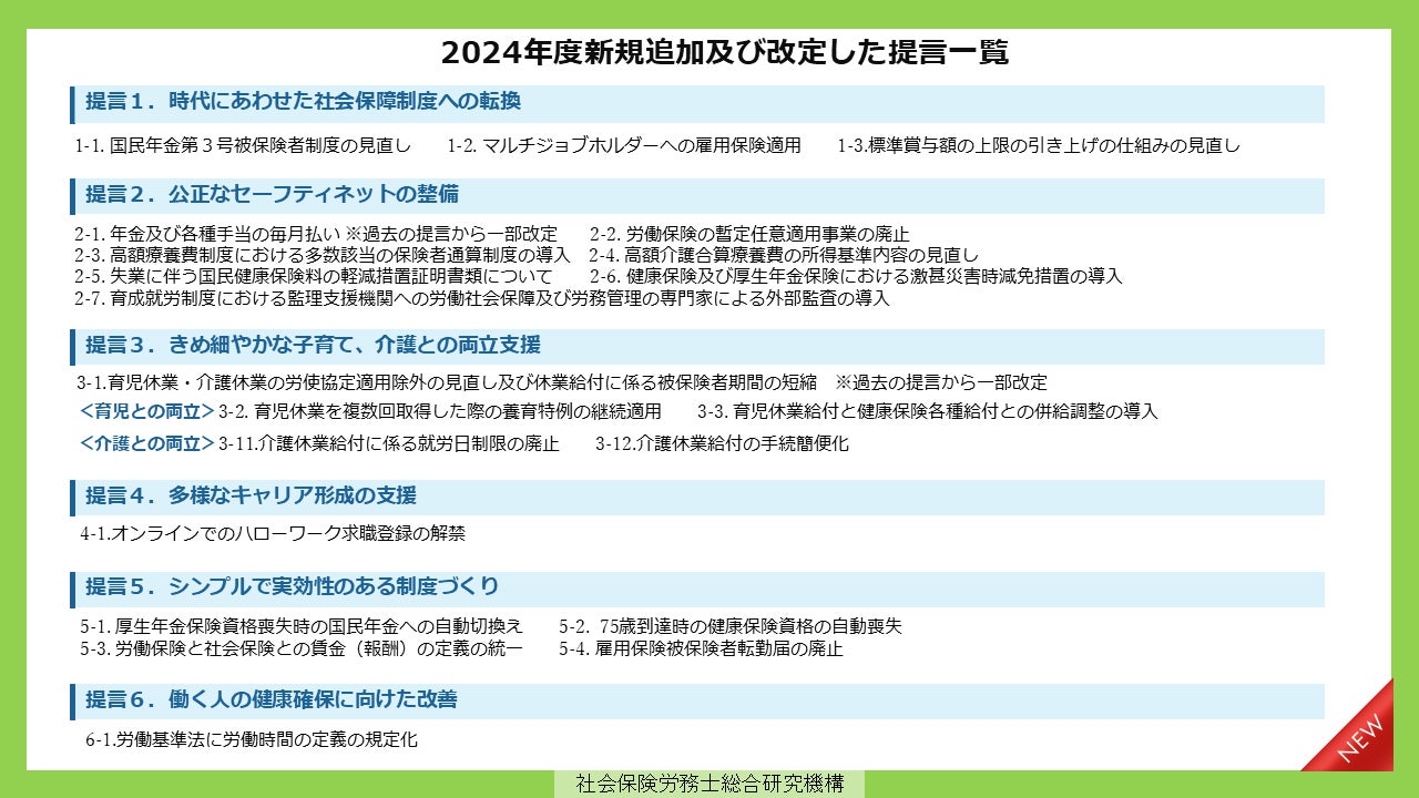 提言の取りまとめにあたっては、全国の社労士から広く意見募集を行っており、本年度においては、「多様なキャリア形成の支援」「きめ細やかな子育て、介護との両立支援」「時代にあわせた社会保障制度への転換」などの観点で整理したうえで、過去の提言に新たな視点を加え改定した提言2項目と、新たに寄せられた意見に基づく提言19項目を加えた47項目の提言を取りまとめた。