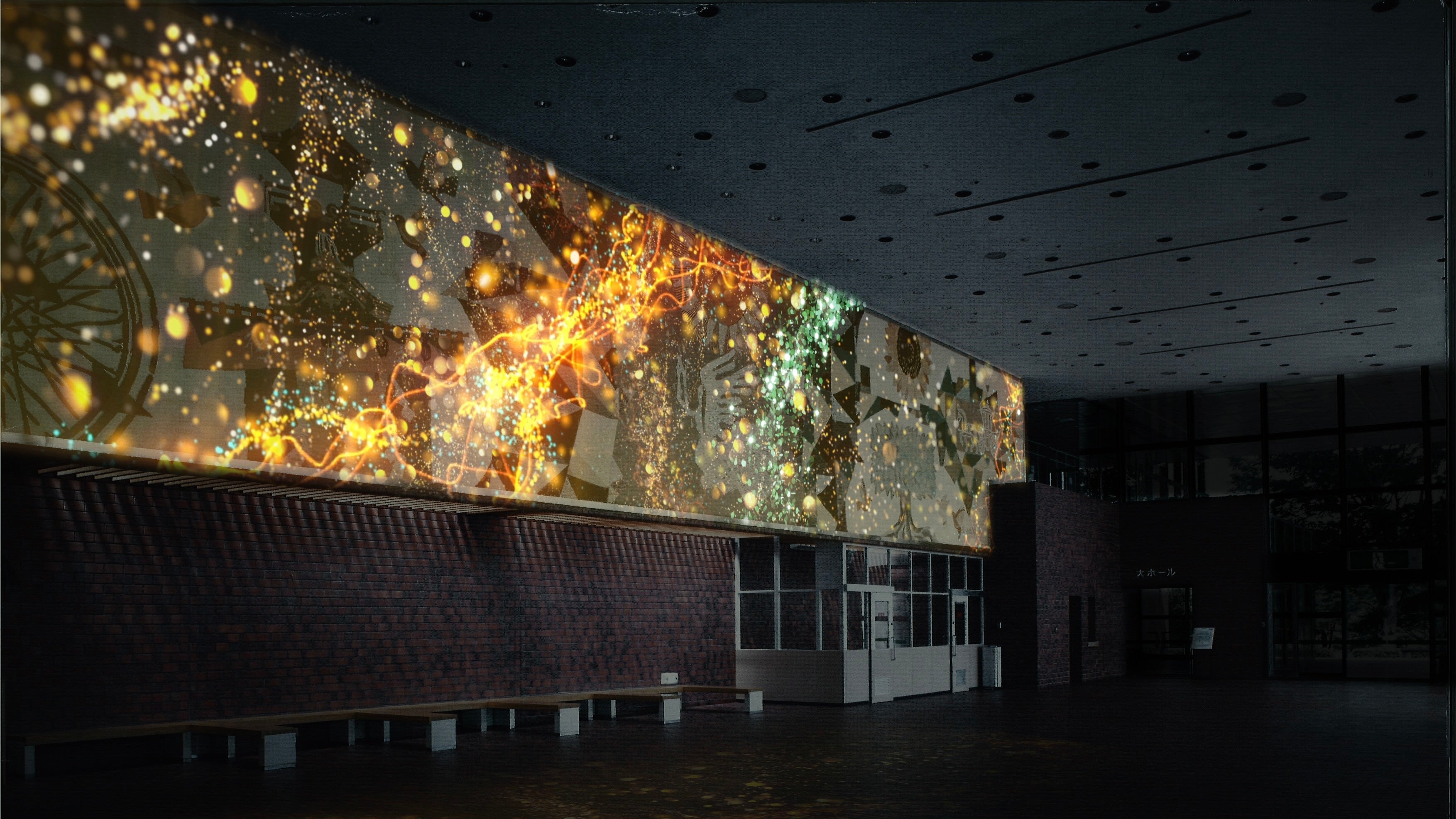 豊田市民文化会館 市民ロビーにある大壁画「まちの無限の発展」の全面に幻想的なプロジェクションマッピング映像を投影します。
