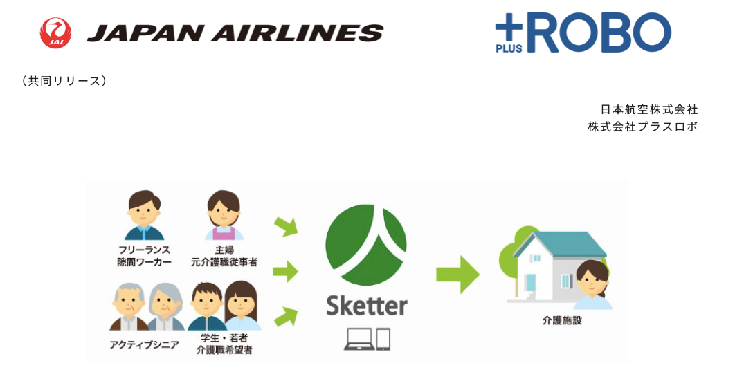 株式会社プラスロボ(本社: 東京都港区、代表取締役社長: 鈴木亮平、以下「プラスロボ」)と日本航空株式会社(本社: 東京都品川区、代表取締役社長: 鳥取三津子、以下「JAL」)は、プラスロボが運営する介護福祉に特化した謝礼付きボランティアのマッチングサービス「Sketter(以下「スケッター」)」を通して、ボランティア活動者を対象としたマイル提供サービスを開始します。