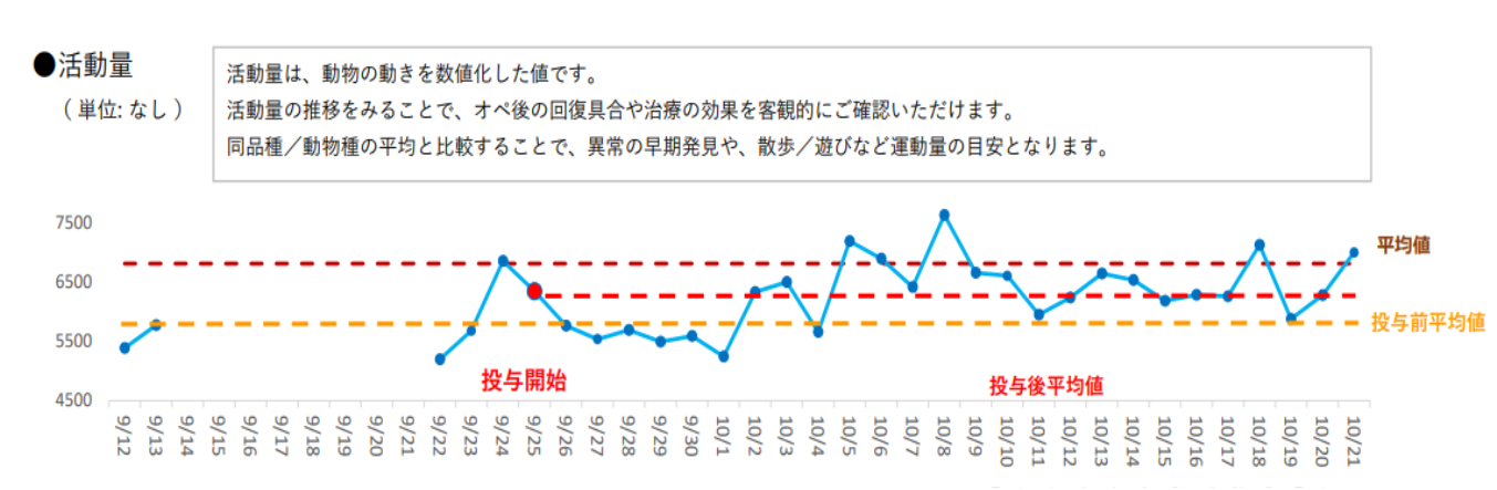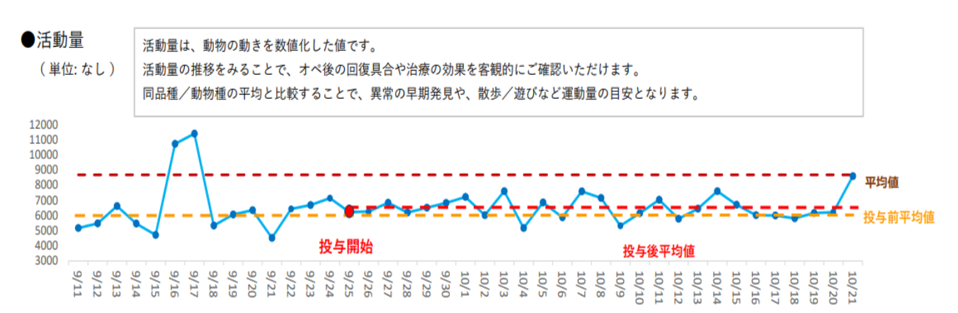 ・元気度、活発度の向上(機嫌がよい、室内で元気に遊ぶ、活動量が安定するなど)