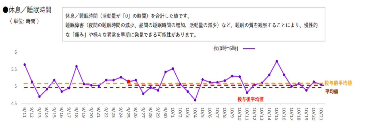・2週間後、CBD1%含有オイルを体重別摂取目安量(2mg/kg)を14日間継続的に与え、活動量計での日中の活動量の比較、夜間の活動量の比較、また、ペインスケール(CIBP)にて痛みや生活の充実度を評価。