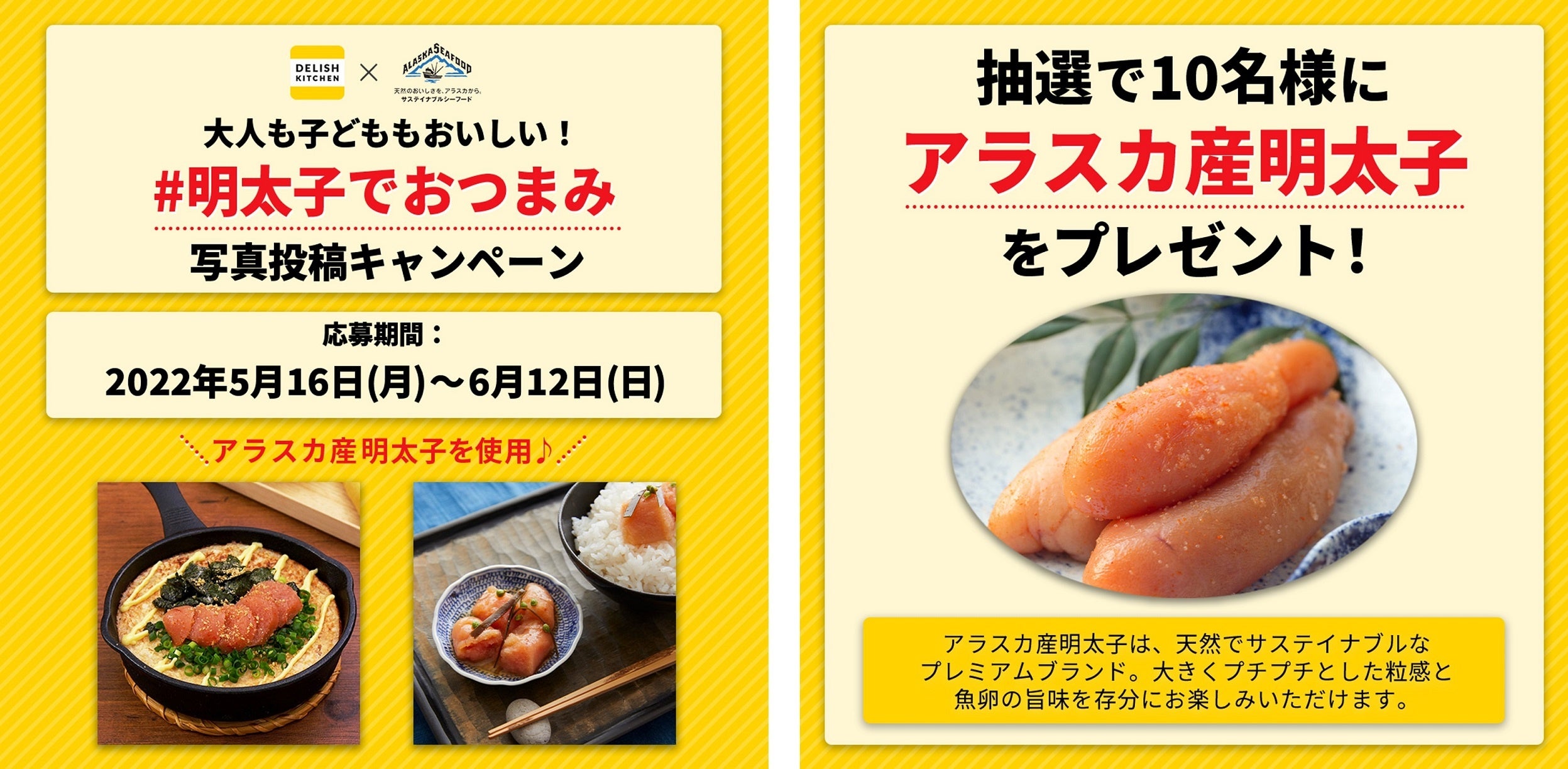 動画の公開を記念し、アラスカシーフードマーケティング協会のInstagramアカウントでは、本日5月16日(月)よりプレゼントキャンペーンを実施。キャンペーン期間中、『DELISH KITCHEN』の「明太マヨとろろ焼き」、または明太子をつかったおつまみレシピに、指定のハッシュタグをつけてInstagram上に投稿いただいた方の中から抽選で10名様に「アラスカ産明太子」をプレゼントいたします。