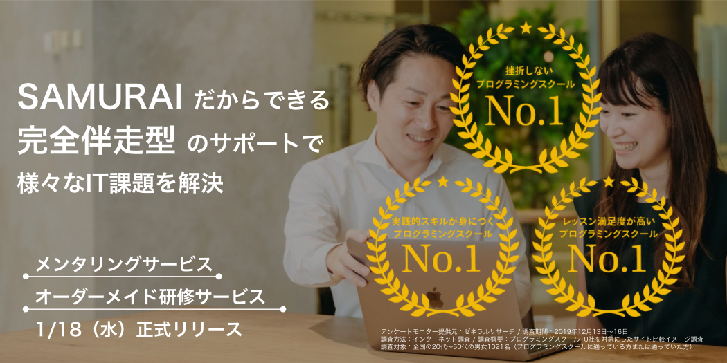 プログラミングスクール「SAMURAI ENGINEER」を運営する株式会社SAMURAI(本社所在地:東京都渋谷区、代表取締役 :佐藤 大央)は、企業のDX推進目標の達成や新規サービスの開発に向けたプロセスを現役エンジニアがサポートする、法人向け「メンタリングサービス」を1月18日(火)に正式リリースいたします。