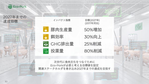 当社は、ICT/IoT/AI等データテクノロジーを統合的に養豚生産現場に活用する事により、2027年迄の短期達成目標「豚肉生産量50%向上・餌効率30%向上・GHG排出量25%削減・投薬量80%削減」の達成を掲げ、タンパク質危機回避および畜産環境負荷低減の実現に取り組んでおります。