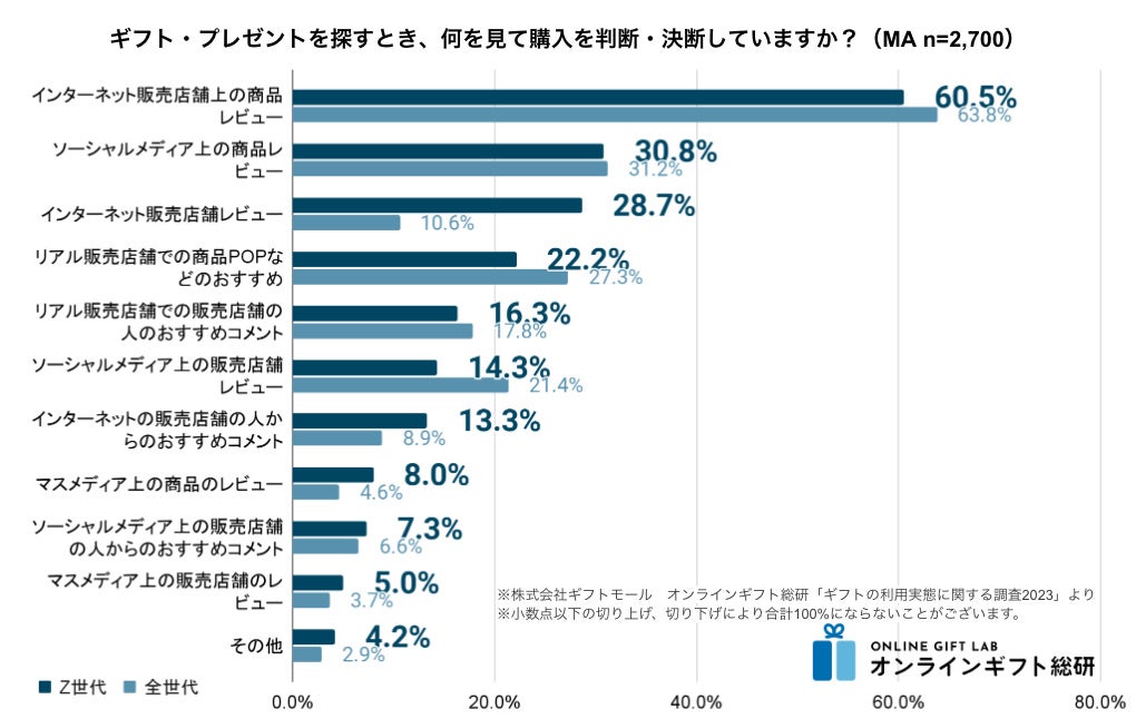 ギフト購入の判断、決断の材料についてもZ世代は他世代と比較して特徴的な傾向が見て取れます。全世代の合計では、1位がインターネット販売店舗の商品レビュー、2位がインターネットの販売店舗のレビュー、3位がリアル店舗の店長、店員のおすすめコメント と続きます。
