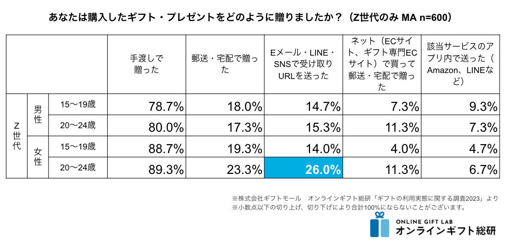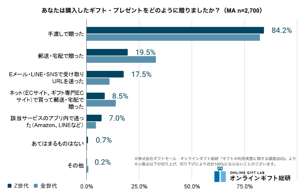 贈り方:1位手渡し 2位ソーシャルギフトのZ世代 vs 1位手渡し 2位郵送・宅配の他世代