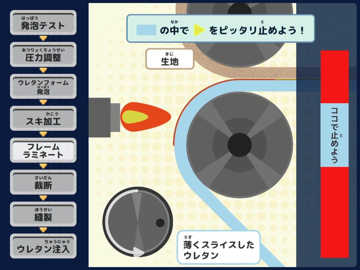 だからこそ私たちは、その見えない技術を、子どもたちが体感できるゲームとして設計しました。ヘッドレストの製造工程を体験しながら、「なぜこの工程が必要なのか」「素材はどのように生活を支えているのか」を自然と考えられる構成にしています。