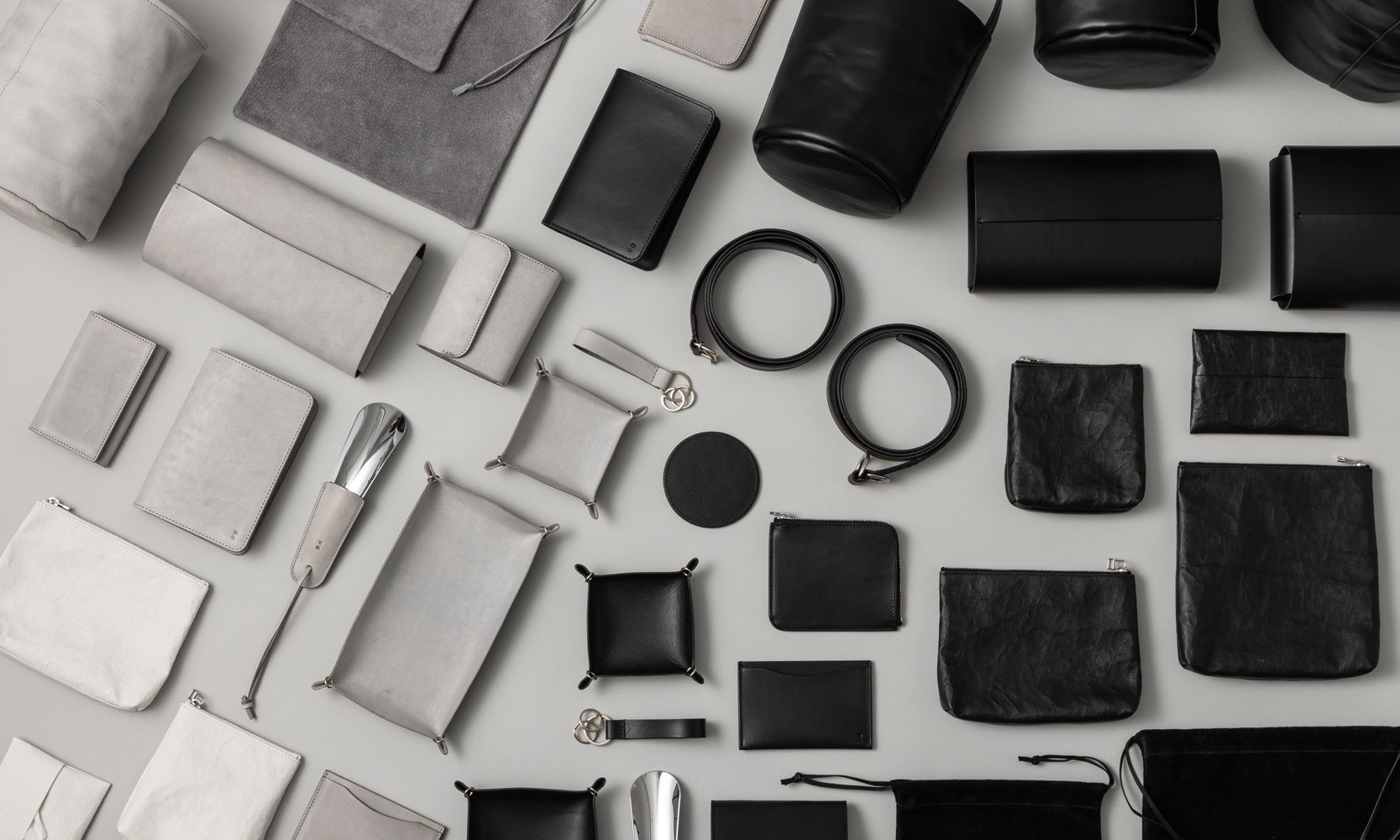 1枚ずつ手作業でなめしたバケッタレザーや日本国内産のピッグスエード、なめしの工程で水の使用量を従来の1/10まで削減したエコレザーなどを使用した 財布・カードケース・バッグなど全26種類を展開いたします!
