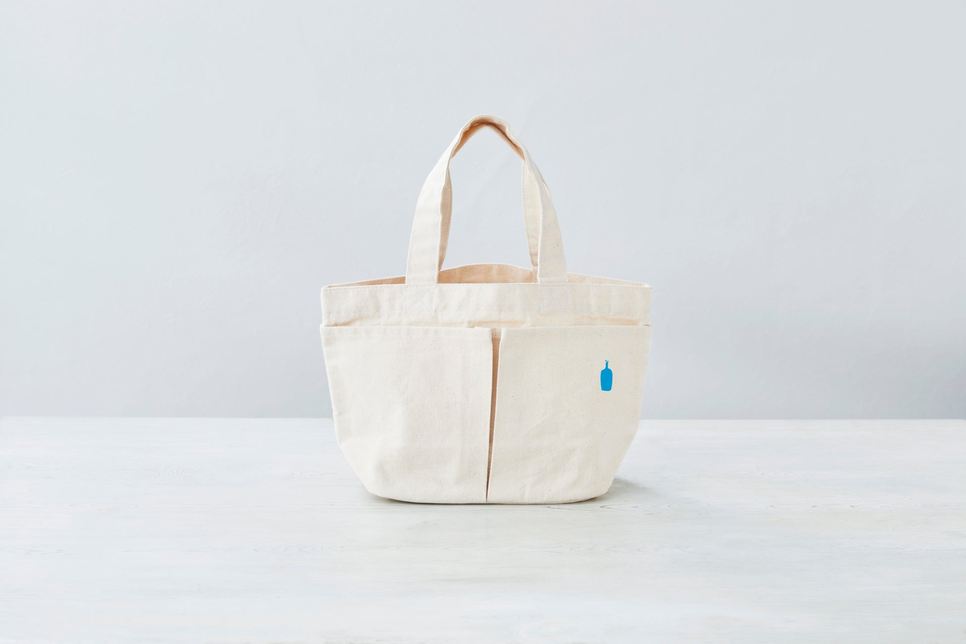 限定発売のこちらのコットントートバッグは、バッグの外側についた大きな4つのポケットが目を引くデザイン。マチもありランチボックスやマイボトルも入る大きさで、ピクニックやサブバックとしても使いやすい機能的なトートバッグです。ボトルロゴがさりげなくあしらわれた、ブルーボトルらしいシンプルなデザインで、服装やシーンを選ばずお使いいただけます。