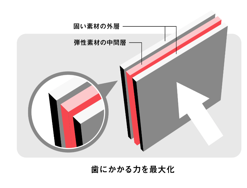いくら良いシミュレーションができあがってもマウスピースの品質が低ければ歯を想定通りに動かすことはできません。マウスピースの形状は歯根から歯を動かせるよう歯肉を覆うストレートカットを採用しています。マウスピースの素材には弾性力のある中間層で3次元的な動きを実現し、高い矯正力を持つ三層式を利用しています。