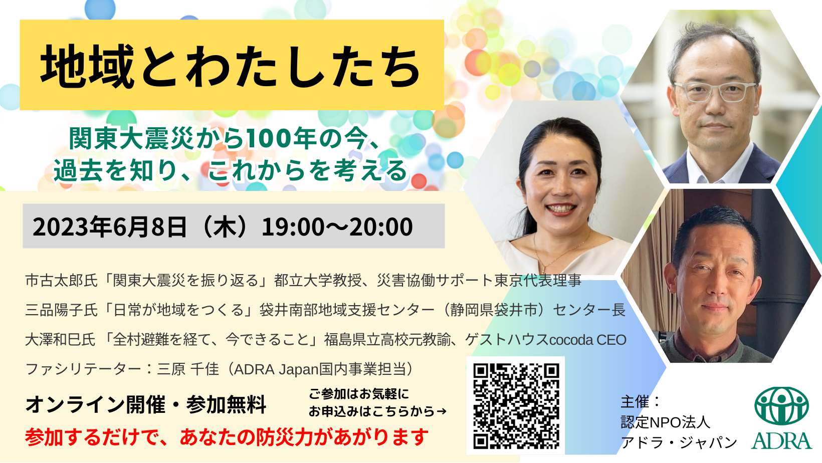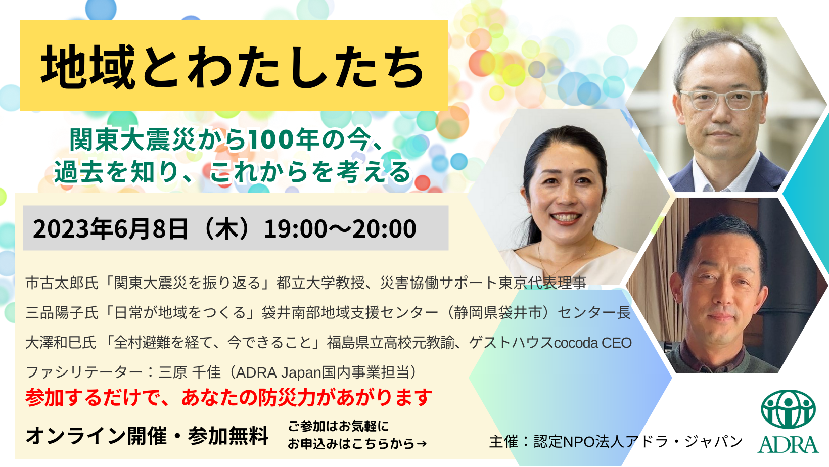 2023年6月8日(木)19:00~20:00。災害が頻発する今、地域の力が必要とされています。知っておきたい事例や心構えを気軽に学べる1時間。