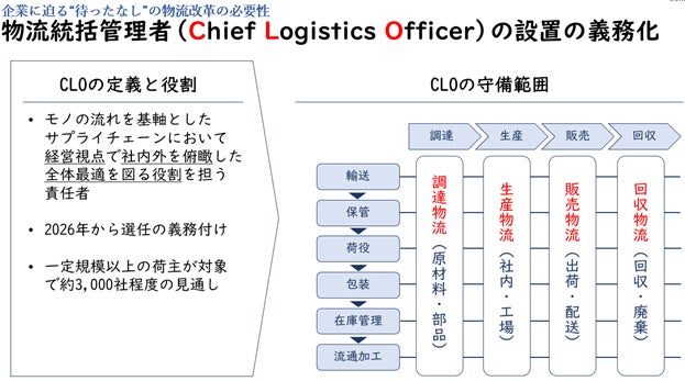 政府は2023年10月、物流革新に向けて即効性の高い施策を「物流革新緊急パッケージ」としてまとめましたが、その一つとして、一定規模以上の発荷主、着荷主に対し、2026年から「物流統括管理者(Chief Logistics Officer、以下CLO)」選任を義務付けています。対象となる荷主企業は3,000~5,000社と推計されています。