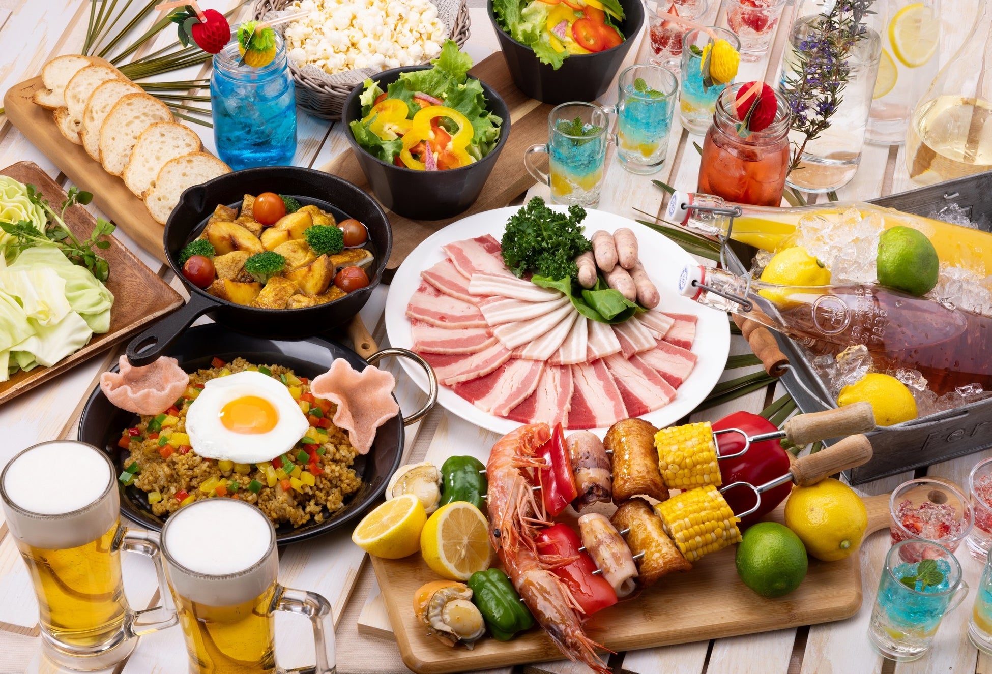 ・料理/ポップコーン・塩だれ生野菜・彩りサラダ・スパイシーチキンと野菜のアヒージョ・シーフードブロシェットフレーバー焼き・食べ放題BBQセット(牛カルビ・豚バラ・ソーセージ・焼野菜)・ナシゴレンとスイートチリソース・デザートブッフェ