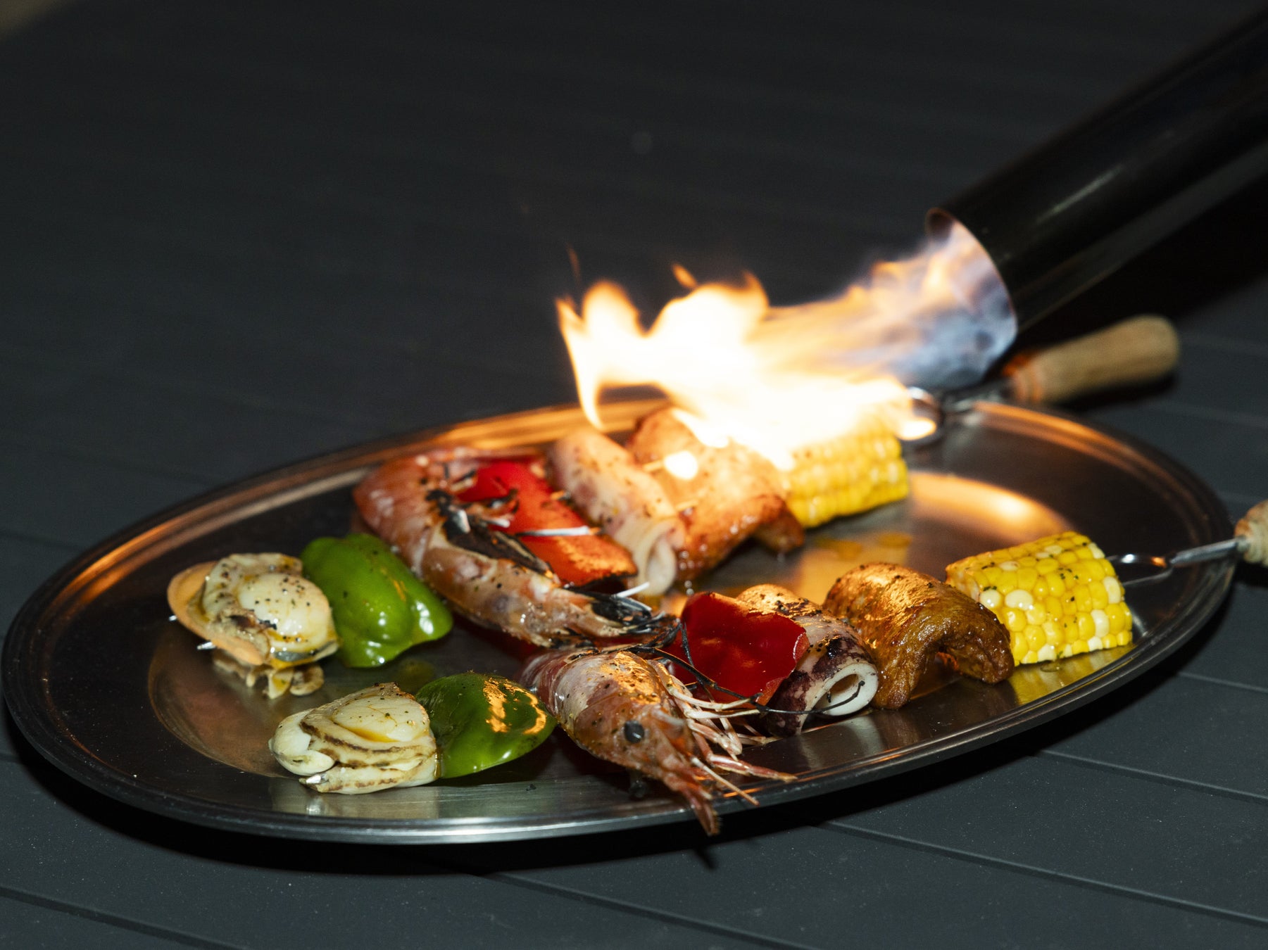 毎年好評の牛カルビや豚バラ肉が食べ放題のバーベキューに加え、写真映え抜群の“シーフードブロシェット”は、バーナーで豪快に炙ることで香ばしさを引き立てます。さらに、お酒がすすむ“スパイシーチキンと野菜アヒージョ”、〆にぴったりのナシゴレン、女性に嬉しいデザートもブッフェスタイルでお楽しみいただけます。