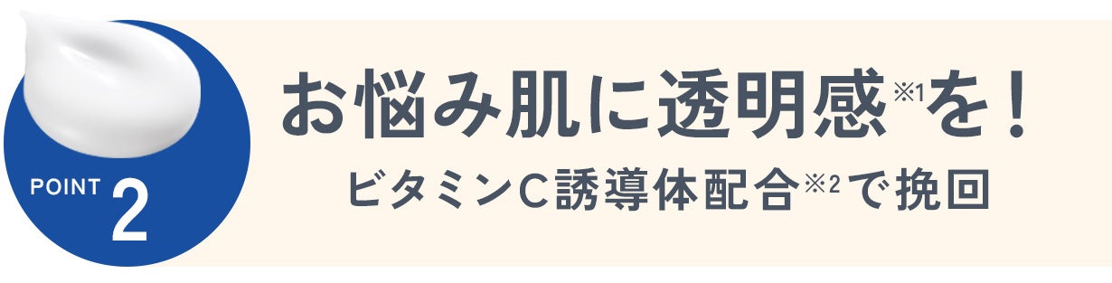 お肌のコンディションを整える「ビタミンC誘導体※2」を配合し、気になるお悩みもしっかり挽回。くすみ※3を保湿して透明感※1のあるお肌へ、さらに未来の発光美肌※1も守り抜きます。キメの整った、均一な肌印象を目指しましょう。