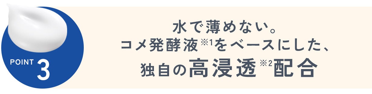 つけた後、潤いを感じさせる「コメ発酵液※1」を水の代わりにベースとして使用。有用成分を角質層まで送り届けるブースターのような使い心地で、保湿効果も高められます。