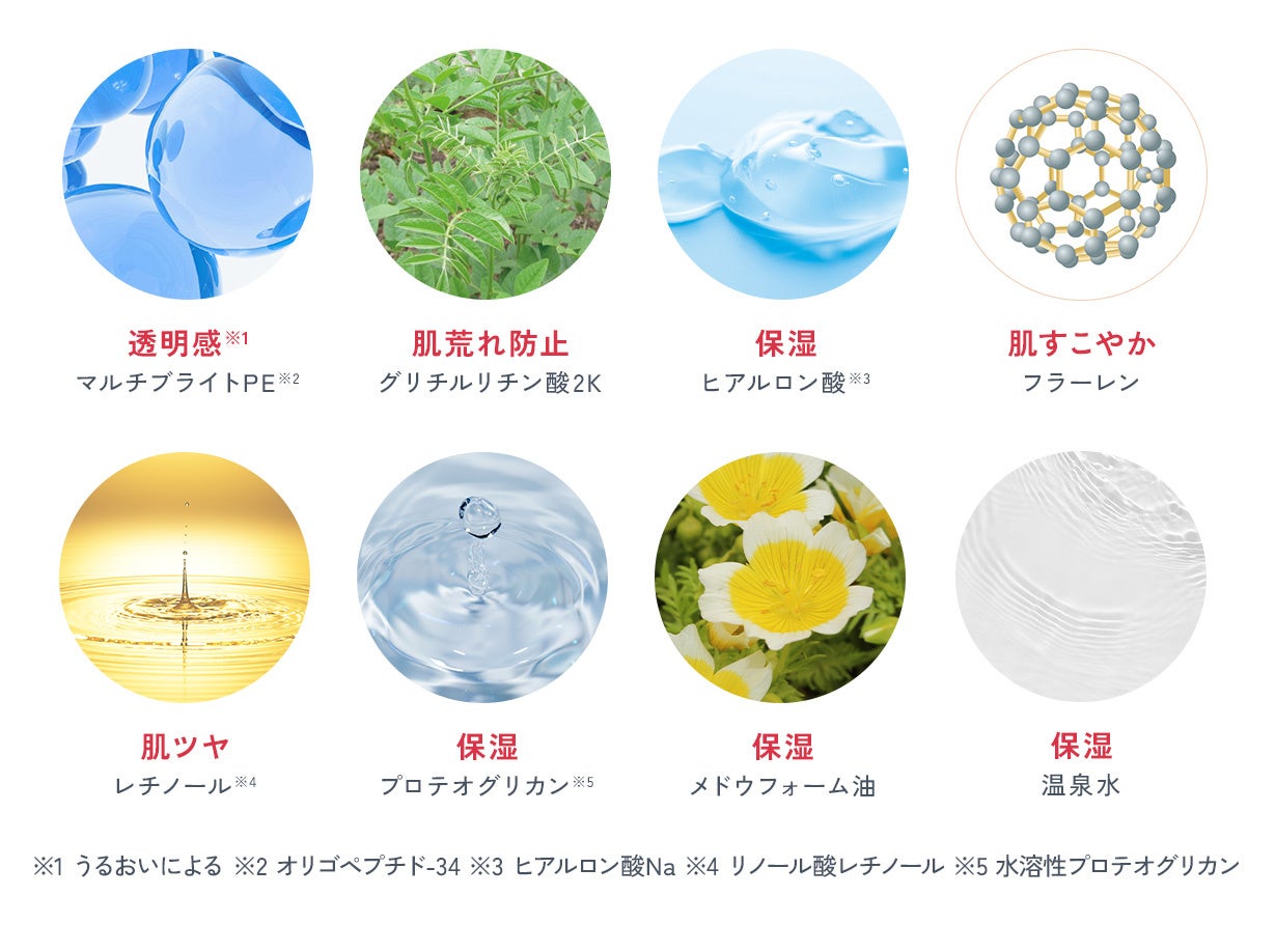 ※1 乾燥によりくすんで見える肌にうるおいを与えること ※2 乾燥した肌の状態のこと ※3 オリゴペプチド-68(うるおいによる透明感ケア成分)