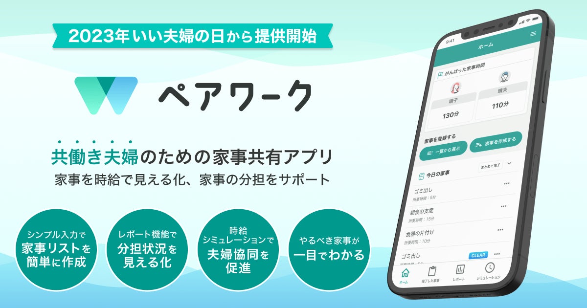 共働き夫婦のための家事共有アプリ『ペアワーク』を11月22日(水)「いい夫婦の日」に提供開始!家事の可視化で家事分担をサポート
