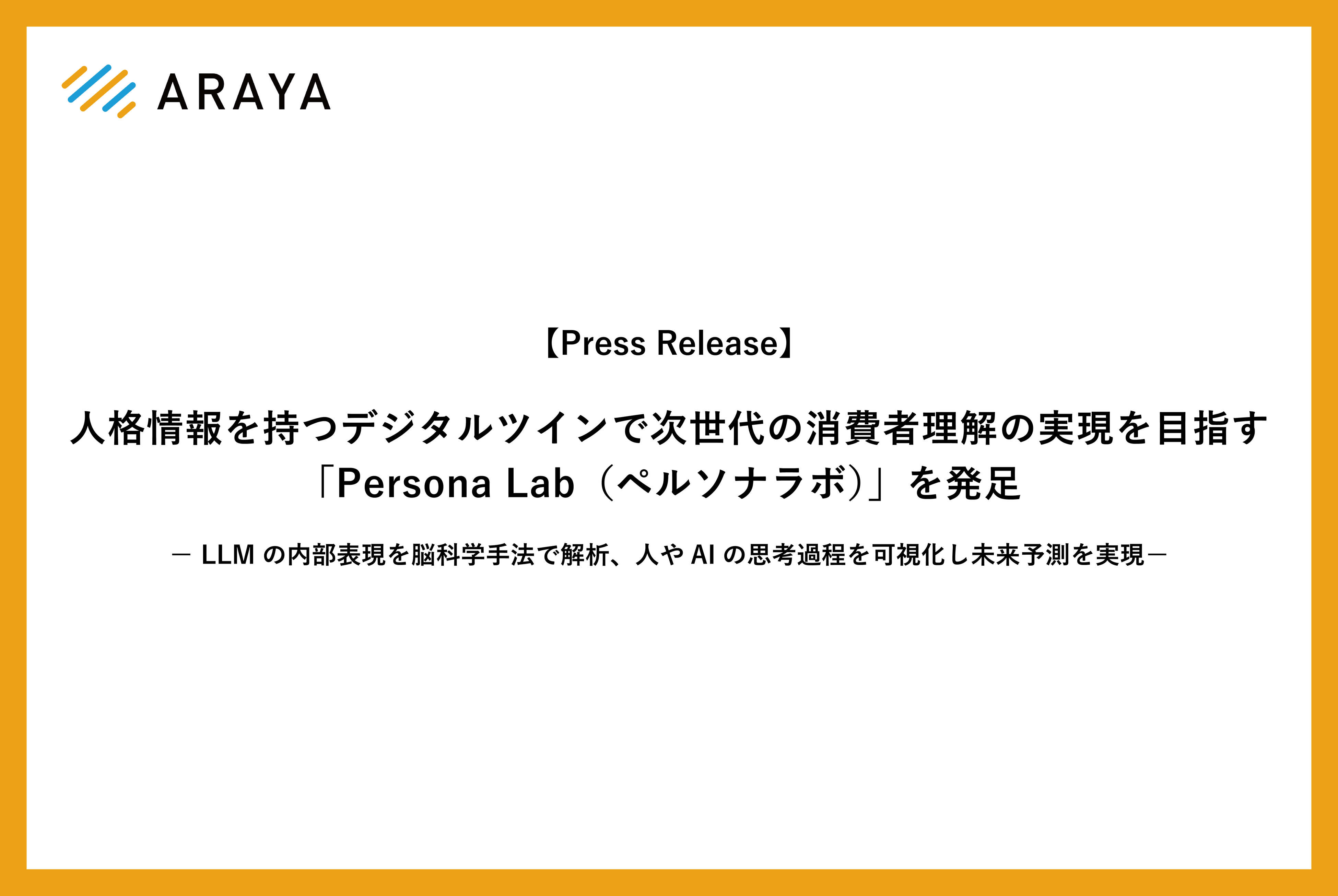 株式会社アラヤ(所在地:東京都千代田区、代表取締役:金井良太、以下「アラヤ」)は、この度、デジタルツインに「行動・生体データ」を融合し、次世代AIによる高精度な未来予測を目指す「Persona Lab(ペルソナラボ)」を発足させたことをお知らせします。大規模言語モデル(LLM)の内部表現を脳科学の手法で解析するアプローチ(AIを脳科学する)の基礎研究や事業活用への応用を目指します。