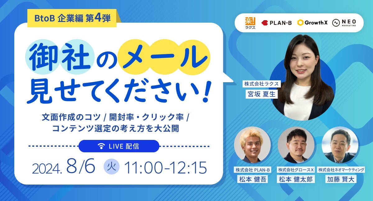 株式会社ラクス・株式会社PLAN-B・株式会社グロースX・株式会社ネオマーケティングのメール施策について、実際に配信している文面とポイントを大公開