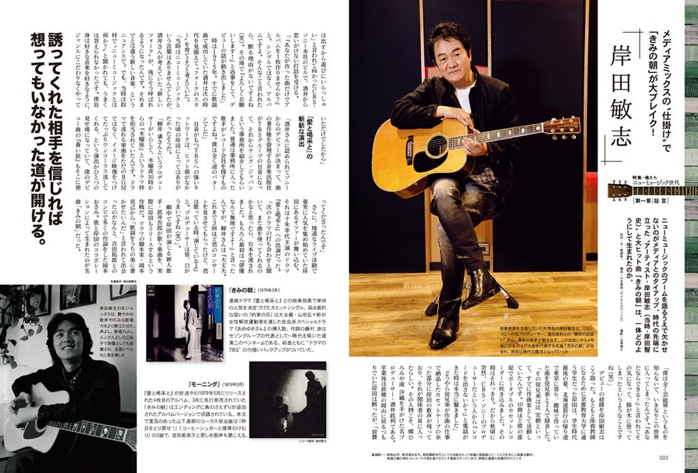 フォークグループとしてデビューし今年で50周年、当時まさにニューミュージックへ進化を遂げていった アリスの3人を表紙と巻頭インタビューに迎え、さらに 岸田敏志さん、永井龍雲さん、渡辺真知子さん、尾崎亜美さんといった豪華なアーティストたちが続々と登場。当時の制作陣にも取材し、ラジオや雑誌メディアなど周辺シーンについても掘り下げるなど、多方面からニューミュージックの魅力に迫ります。