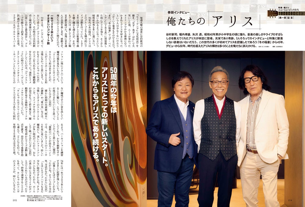 俺たちが小中学生の頃に憧れ、音楽の楽しさやライブのすばらしさを教えてくれたアリス。3人そろってのインタビューに歓喜しない読者はいないだろう。我々の多くが初めてアリスを認識したであろう「冬の稲妻」から45年、デビューから50年。時代を超えたその輝きは多くのことを俺たちに訴えかける。