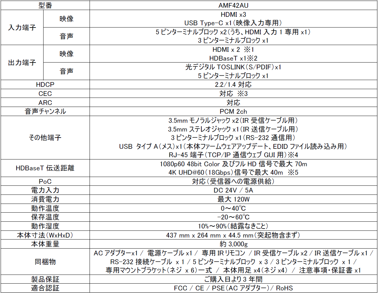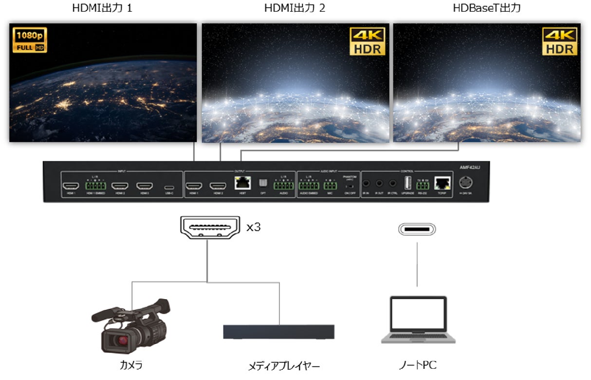 AMF42AUは、最大4K@60 4:4:4(18Gbps)信号入力が可能なHDMI入力3系統とUSB Type-C入力1系統の計4系統入力端子に、任意のフォーマットへアップ(ダウン)スケーリング変換、および、ルーティング出力可能な2系統のHDMI出力と1系統のHDBaseT出力端子を搭載したシームレス切替え対応マルチフォーマットプレゼンスイッチャーです。