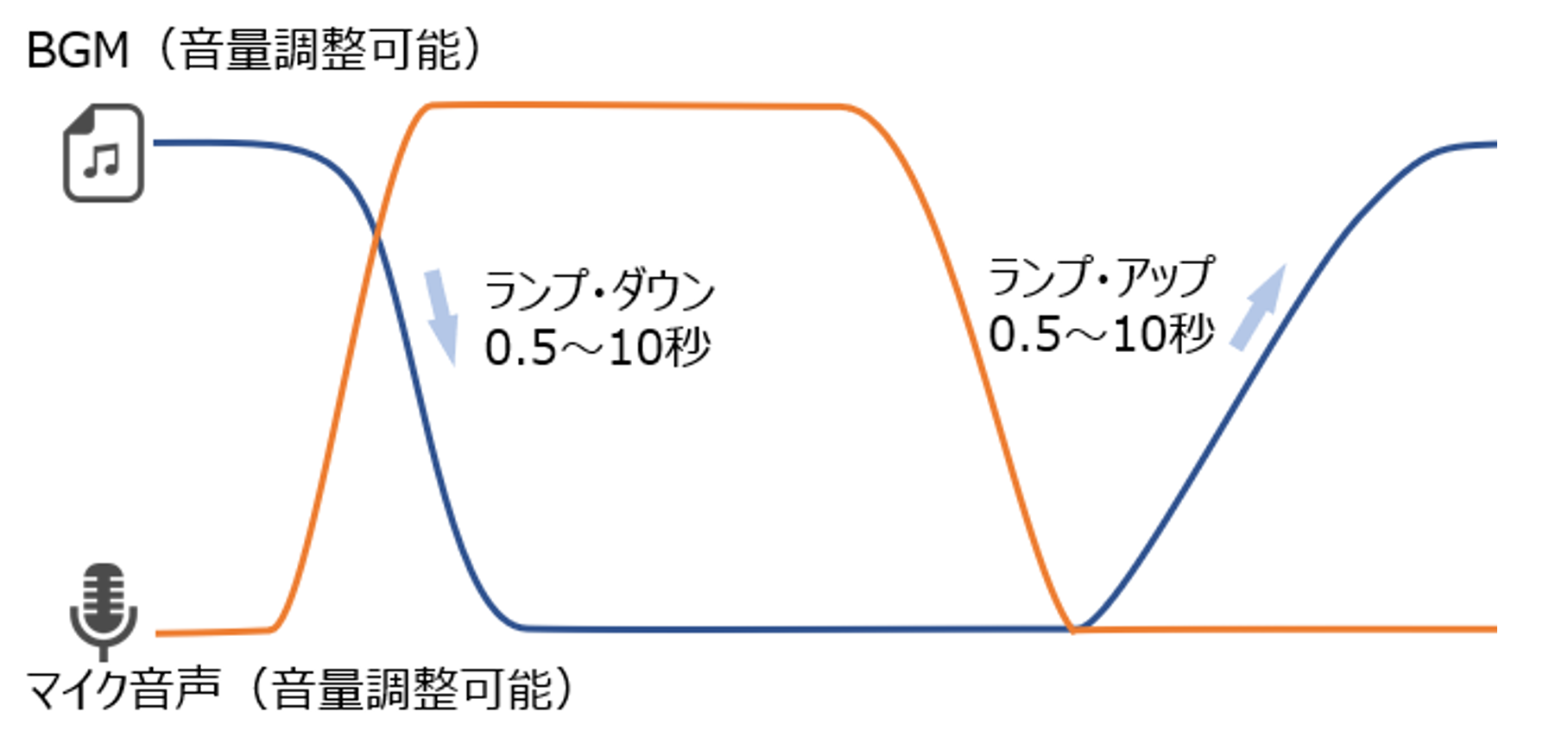 マイクからの音声を自動検知しBGMとマイクからのオーディオソースを任意設定した間隔や音量値で自動ミキシング制御するトークオーバー機能を搭載します。マイクからのオーディオ信号を検知するとBGM音量を自動抑制(ランプ・ダウン)させて講演者の声を聞きやすくします。また、マイクからのオーディオ信号が任意設定した時間、未検知状態になるとマイク音量を抑制しBGM音量を自動的に元に戻します(ランプ・アップ)。