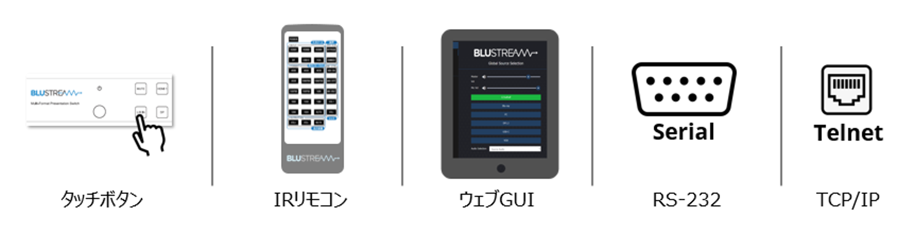 - 多様な制御方法│本体タッチボタン/IRリモコン/ウェブGUI/RS-232