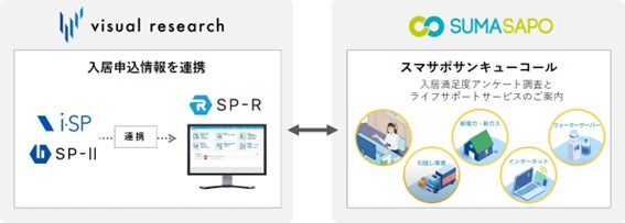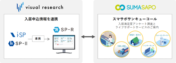 本締結によりビジュアルリサーチが提供する賃貸仲介システム「SP-R」のWEB申込機能と、スマサポが提供する「スマサポサンキューコール」が連携し、入居者情報が一気通貫の自動データ連携となり、タイムリーかつ高精度で連動することが可能となります。