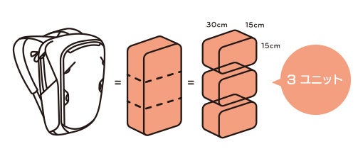 ※トラベルバッグ収納目安のユニット換算では、「スモール」が1ユニットに該当します。「Xスモール」はスモールの約1/2サイズ、「XXスモール」は約1/4サイズです。