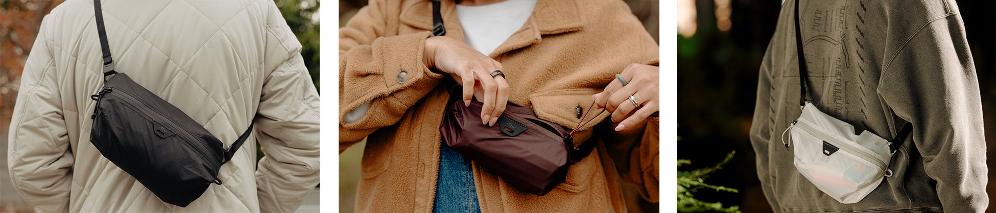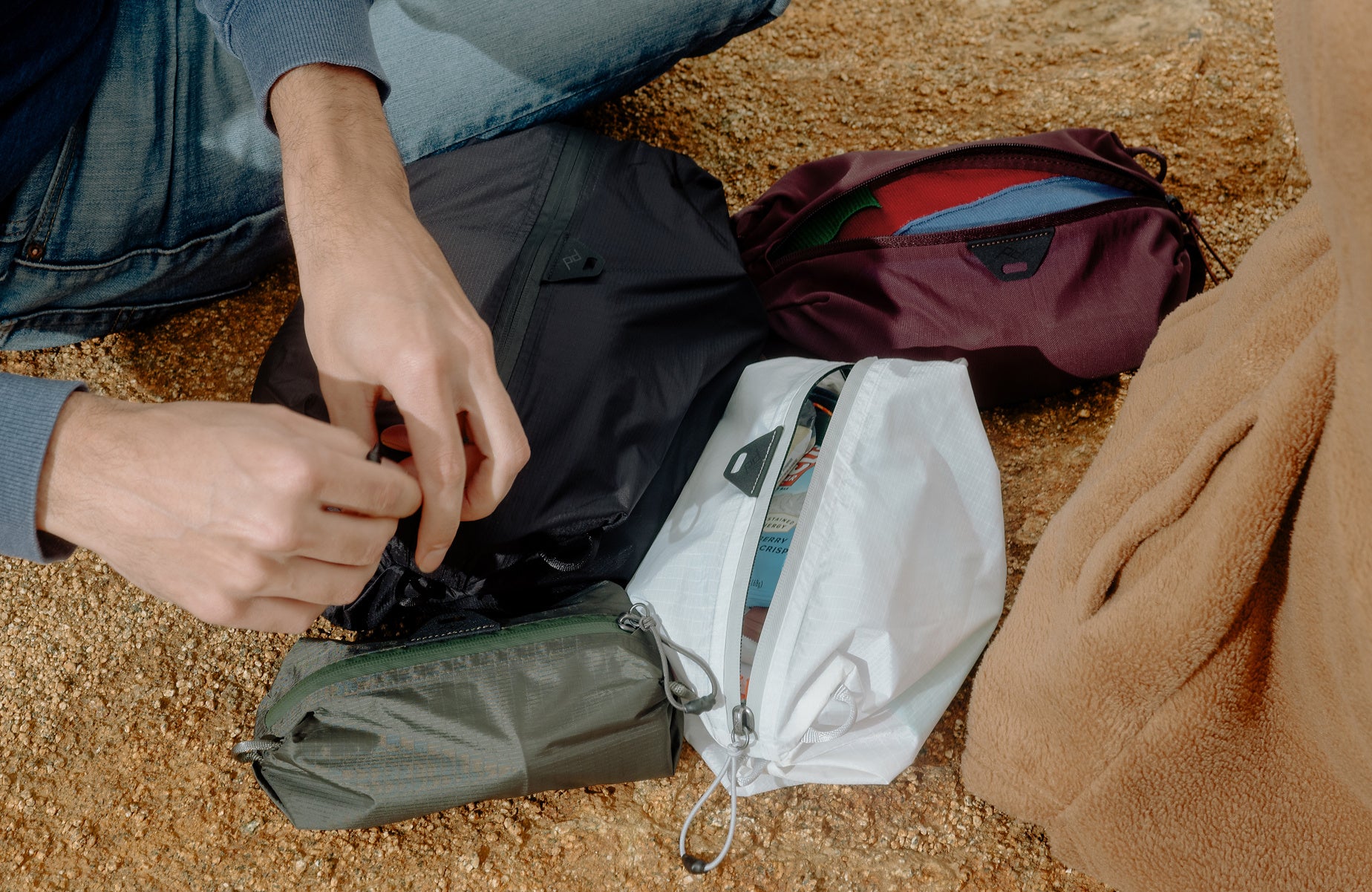 ポーチ上部のコードフックループに別売りのピークデザイン製ストラップやフラットフックストラップ(発売予定)を取り付けるだけで、超軽量なスリングバッグに早変わり。必需品だけをまとめてそのまま持ち出せるので、旅先でのちょっとした外出時に便利です。