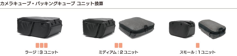 ピークデザインのトラベルバッグはモジュールシステムを採用し、それぞれのバッグに収納できる容量をユニット数で表しています。