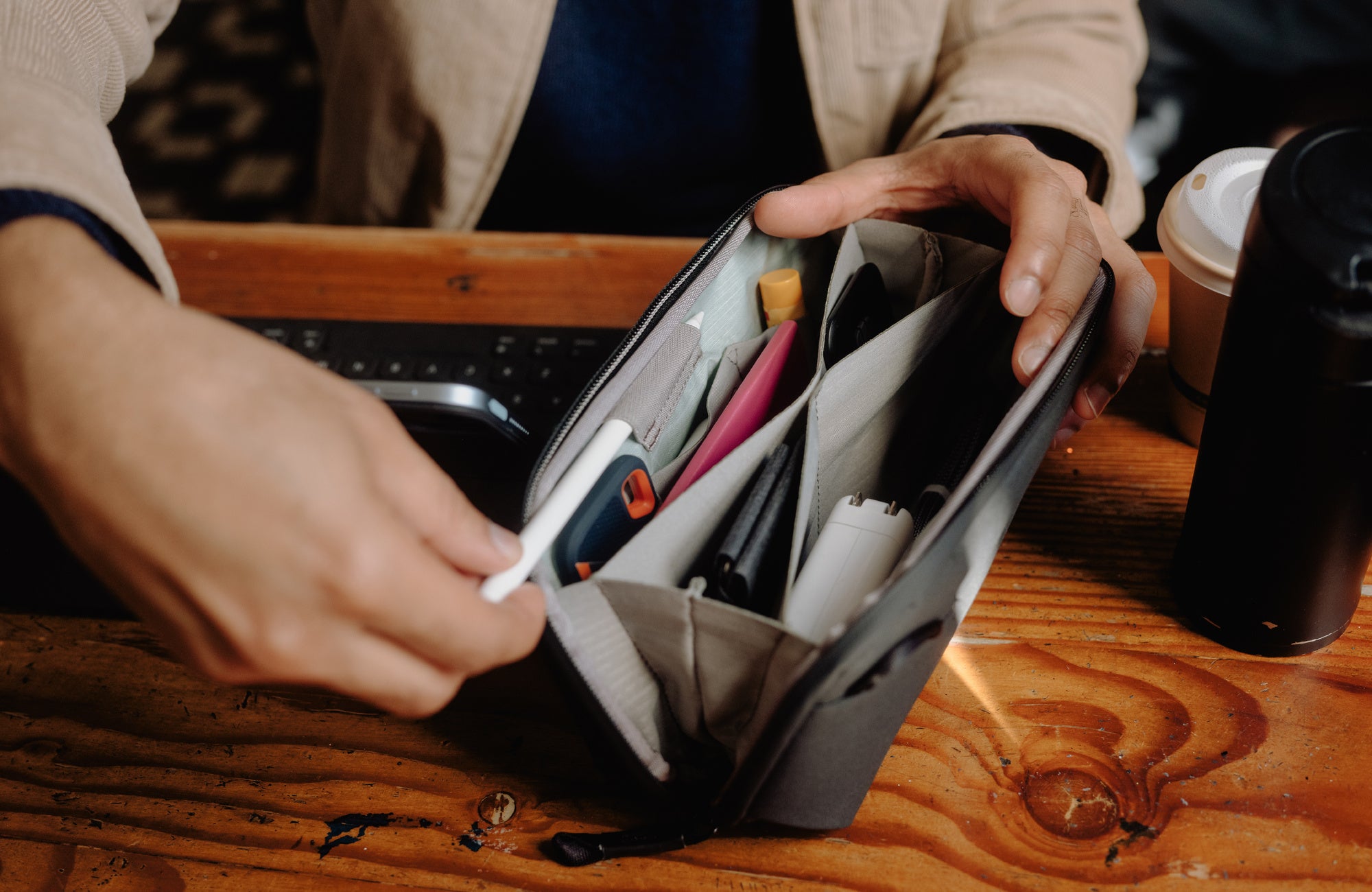 内側には4つに分かれた収納スペースと、オーガナイザーポケットやジッパーポケット、さらにペンホルダーを備えています。また、開口部が大きく開き自立するため、視認性とアクセス性にも優れています。