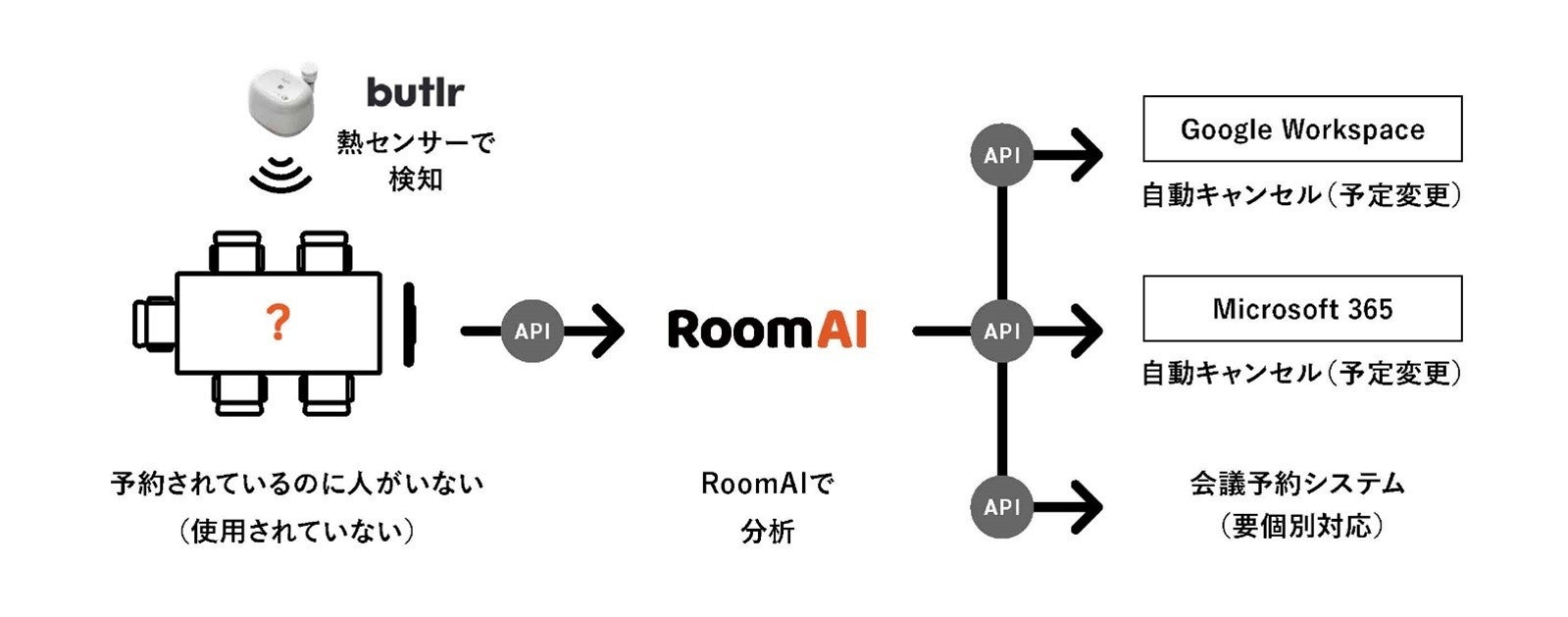 利用状況は会議室予約システム(Microsoft365やGoogle Workspace)に連携され、使われていない場合は自動で予約がキャンセルされます。
