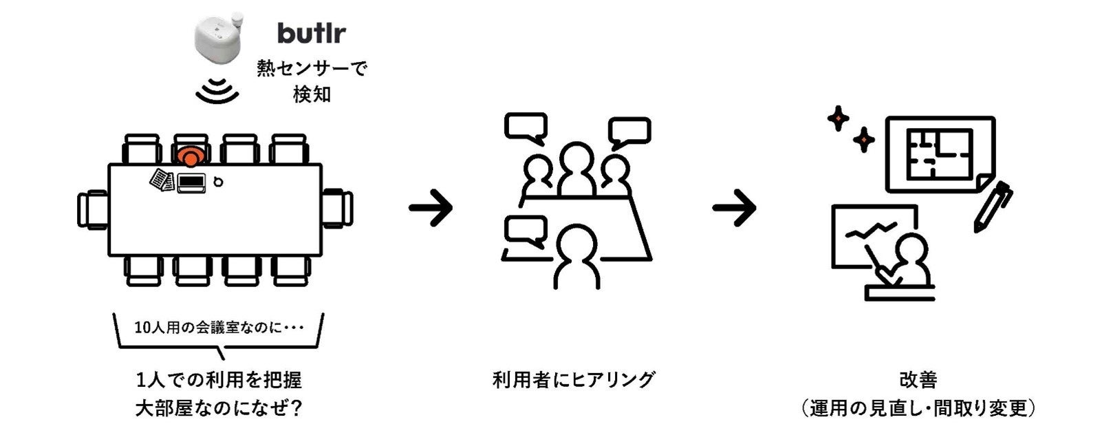 熱センサーで会議室内の人をモニターし、予約通りに使われているかを確認します。