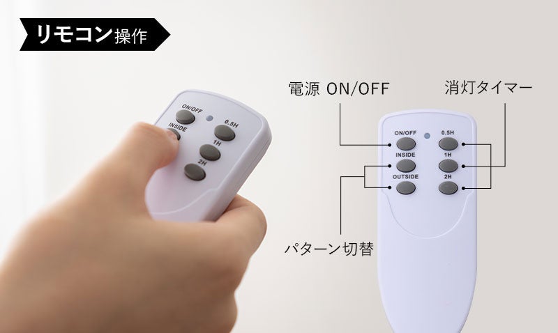 リモコン付き(電池は付属しません)、LED対応 点灯パターン切り替え、1年保証 |