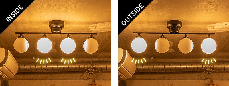 LED電球に対応。LEDは長寿命でとってもエコ。また、インサイド(内側2灯)にLED電球、アウトサイド(外側2灯)に白熱灯を取り付け、リモコン操作の切り替えを利用して、用途に応じたお好みの光の使い分けをすることもできます。