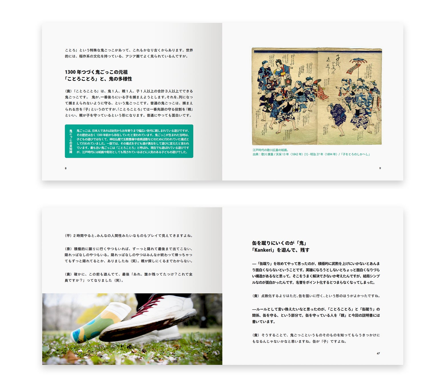 「カンケリ専用カンセット」では、子どもたちに愛された「カンケリ」のシンプルな面白さはそのままに、ルールをまとめています。遊びやすいアイテム一式を収容したプラ製のパッケージは、そのままカンとして使えるよう、蹴りやすい大きさにこだわっています。日本の鬼ごっこ文化の歴史から「カンケリ」に迫る、一般社団法人鬼ごっこ協会による解説本「カンケリのデザイン」もセットになった商品です。