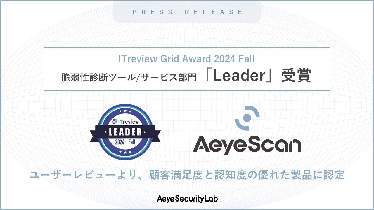 株式会社エーアイセキュリティラボは、アイティクラウド株式会社が運営するビジネス向けIT製品・クラウドサービスのレビュープラットフォーム「ITreview」のアワード「ITreview Grid Award 2024 Fall」において、『AeyeScan』が「脆弱性診断ツール/サービス」部門で「Leader」に選出されたことを発表いたします。